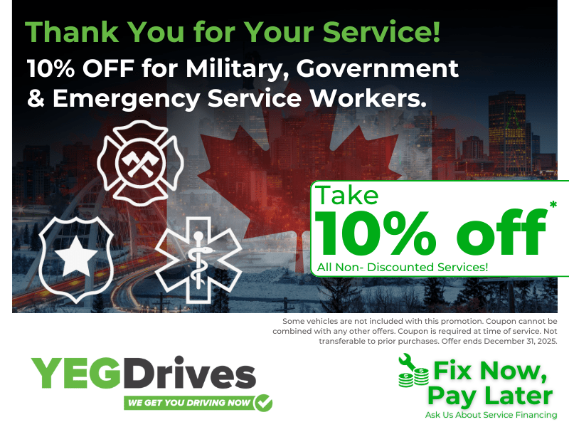 At YEG Drives, we proudly support our military and government workers by offering 10% OFF on all qualifying services and repairs. This is our way of thanking you for your dedication and service. Drive with confidence knowing we’ve got you covered!