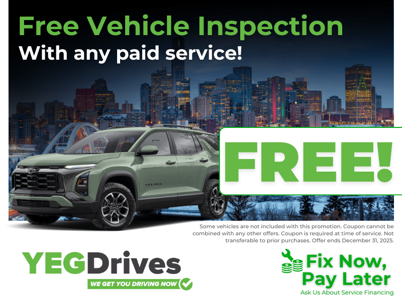 Get a FREE Vehicle Inspection at YEG Drives in Edmonton, AB. Book any paid auto repair or car maintenance service and our expert mechanics will provide a comprehensive inspection at no extra cost.
