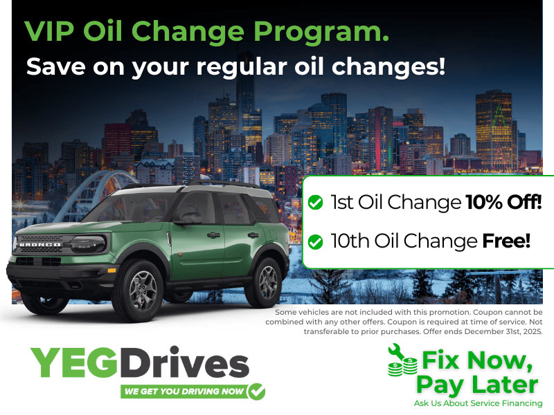 Join the VIP Oil Change Program at YEG Drives and enjoy exclusive savings and rewards! Start with your 1st oil change at 10% off, and as a loyal customer, get your 10th oil change absolutely free. Maintain your vehicle's performance and save with every visit.